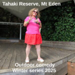 Tessa who is wearing a pink dress is standing on the green at Mt Albert War Memorial Park. She has a microphone in her hand.January 16, 2026 - 6:30 pm